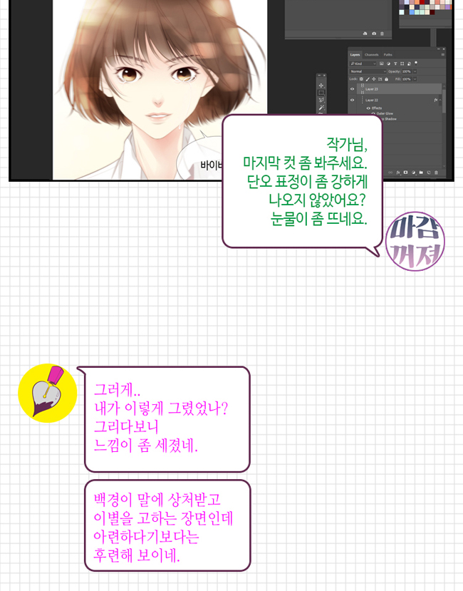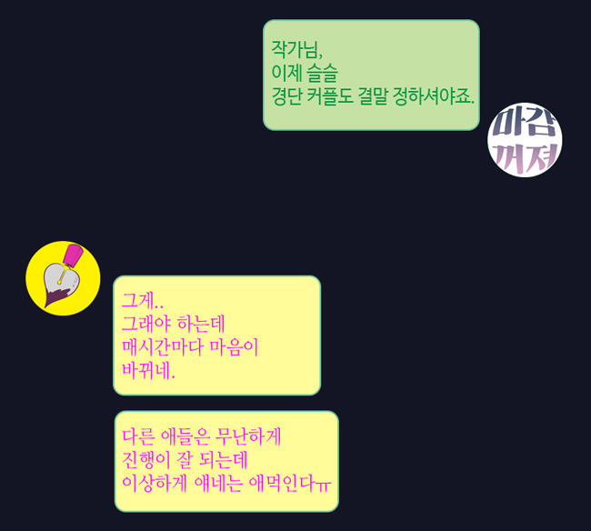 차기작도 작가의 손에 그려진 세계에 살고 있지만, 그곳에 존재하고 살아가는 건 단오와 하루의 의지다. 눈코입 없이 제대로 그려지지 않았던 하루를 단오가 존재하게 했다. 하루의 시작은 단오였고, 단오의 시작도 하루였다. 서로의 시작을 만들어 주기에 존재하는 그런 관계이다. (백경의 시작도 단오였지만 이루어지지는 못했다)